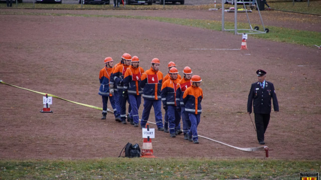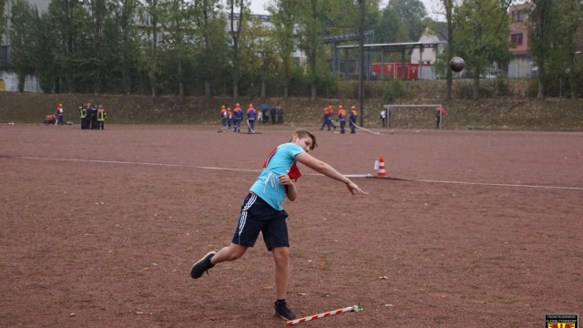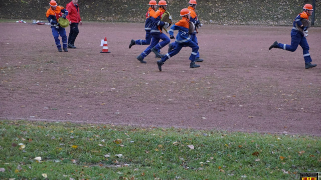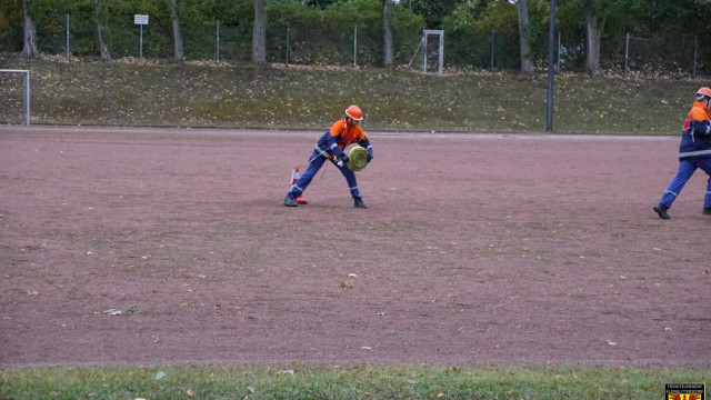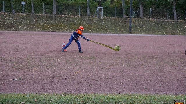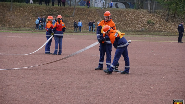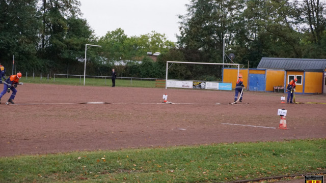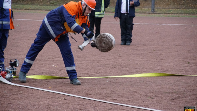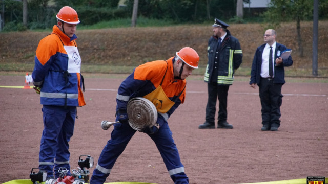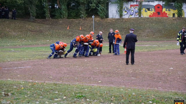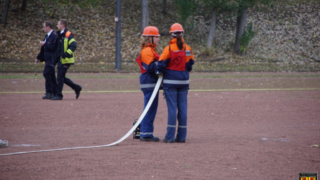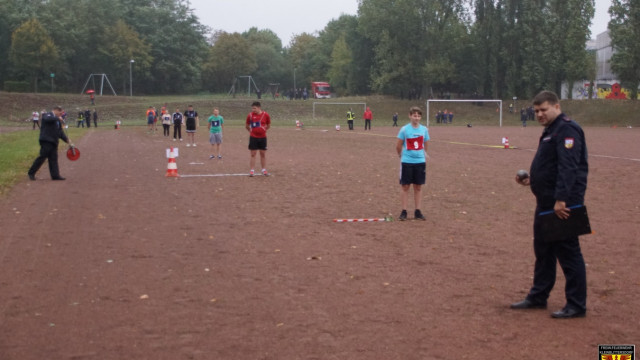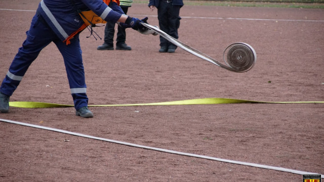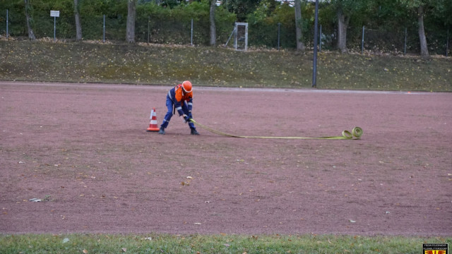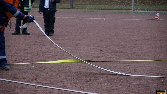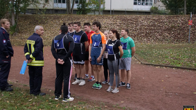 Die Disziplinen: Kugelstoßen, 1.500-Meter-Staffellauf, Fragenbeantwortung, Löschangriff und Schnelligkeitsübung.“