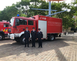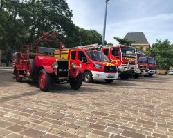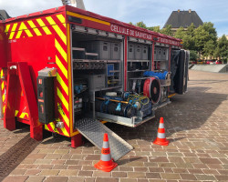 Dort stellte man stolz das Fahrzeug den dortigen Gästen, den französischen Kollegen und den anwesenden Feuerwehren aus Rheinland-Pfalz, Luxemburg und Belgien vor. Beeindruckt auch von den anderen Fahrzeugen sei man durchaus gewesen, denn die französische Feuerwehr mit ihrer Technik kann sich durchaus sehen lassen. Man tauschte vor Ort Erfahrungen aus und sammelte Eindrücke aus anderen, besonders französischen Feuerwehren. Begeistert, wohl wegen der Aufgabenähnlichkeit zum Hanweiler GW-Logistik, der ebenfalls mit einem großen Vorrat an Schlauchleitungen bestückt ist, zur Wasserbeförderung auf lange Wegstrecken, zeigte man sich von einem Schlauchwagen aus Rheinland-Pfalz von der Feuerwehr aus Trier der mit F-Druckschläuchen ausgestattet ist. Dies sind Schläuche mit einem so großen Durchmesser (152mm), wie sie normal bei einer Feuerwehr nicht üblichen sind.