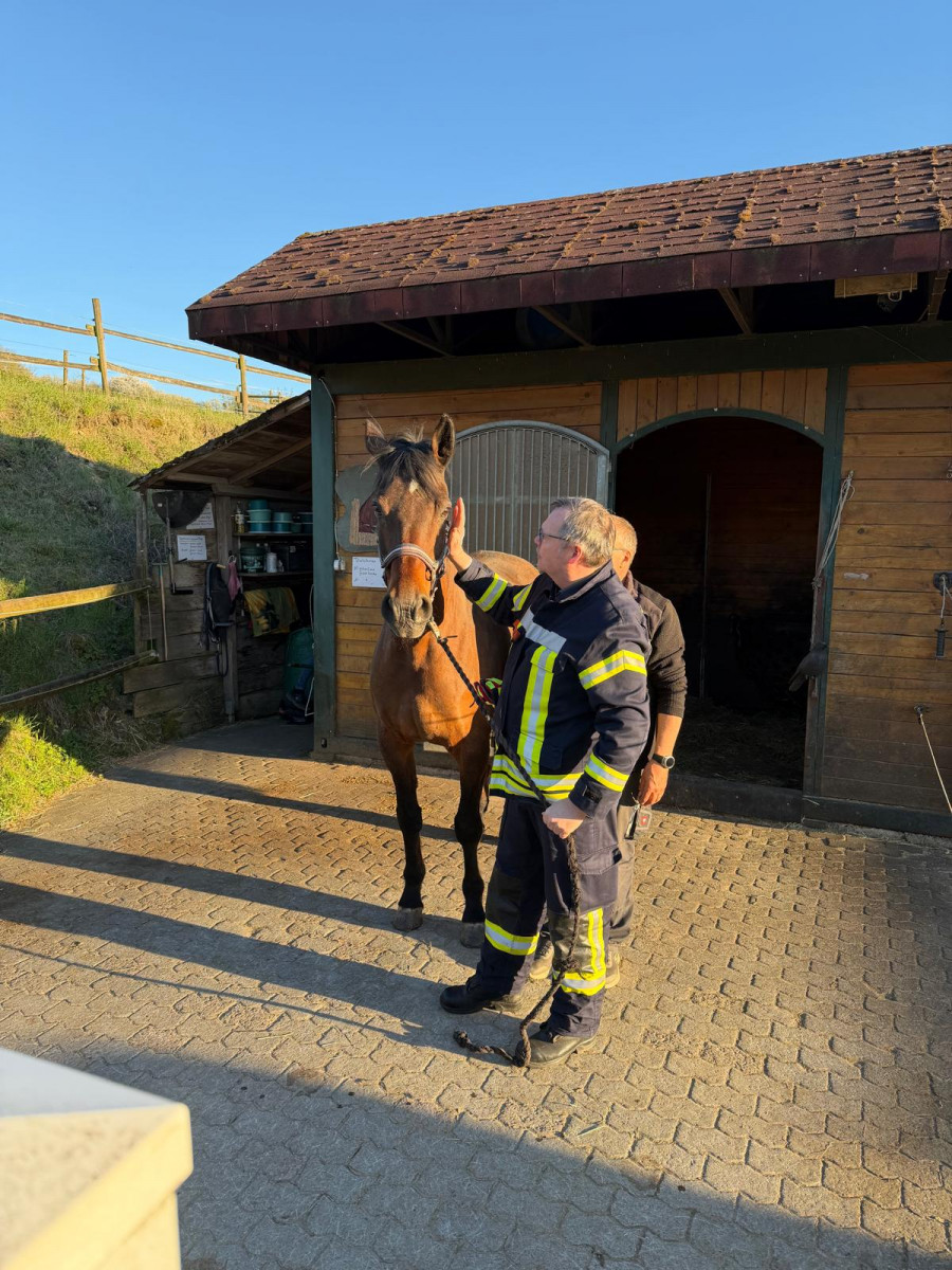 Betriebsleiter Gerald Hector führte durch den Hof und machte auf die neuralgischen Punkte aufmerksam. Er erläuterte, wie die Pferde aus Ihren Ställen direkt auf ein Koppelsystem evakuiert werden können, ohne die für Pferde vorgesehenen, abgesperrte Bereiche zu verlassen. Wer wollte konnte auch einem Pferd ein Halfter anlegen. Es ist aber fraglich, ob das jemandem, der nicht regelmäßig mit Pferden arbeitet, im Einsatz gelingen wird. Es ist ein Unterschied, ob man mit einem Pferd, bei dem eine vertraute Person anwesend ist, arbeitet oder im Einsatz, wenn ein verängstigtes Pferd es mit einer fremden Person zu tun hat.